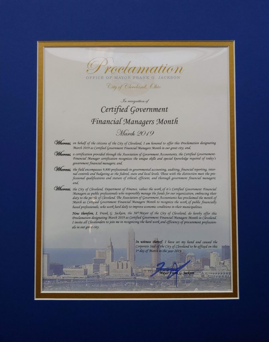 The City of Cleveland, along with The State of Ohio and other State and Local governmental entities, recognize the contributions made by Certified Government Financial Managers and other financial professionals, who work hard on a daily basis to improve economic conditions and support their communities.